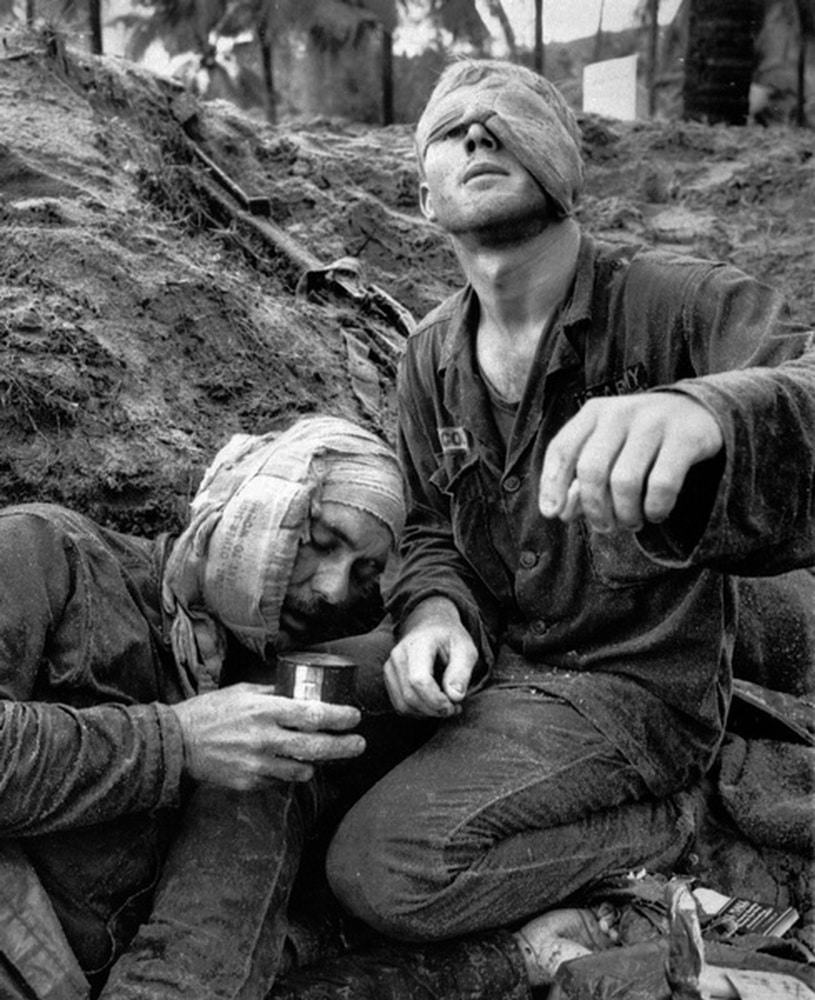 Une compassion qui illumine “An Thi, Janvier 1966“. Le médecin Thomas Cole, la tête enserrée dans un bandage, prodigue ses soins au sergent Harrisson Pell. Comme l’analyse Hal Buell, un ancien directeur d’AP (dans “Henri Huet …”, précité), “Il est évident, lorsqu’on regarde les photos d’Henri, que celui-ci a une formation artistique (…) Il dépasse le furieux chaos de la guerre et introduit une dimension et une organisation qui font entrer le lecteur dans la scène, l’observateur dans la photo et ne laissent pas à l’extérieur“. Dans l’attitude des deux hommes, je vois la représentation classique d’une Pietà, Marie tenant sur ses genoux son fils Jésus-Christ au moment de la descente de croix. Un moment de profonde humanité qui n’est pas saisi dans le marbre mais via un objectif 35mn.