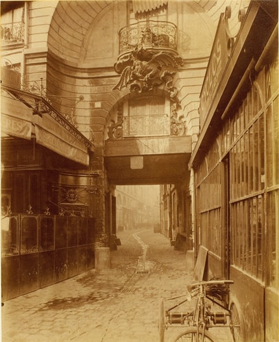 Volatilisés la façade rococo de l’immeuble de Vigné de Vigny, la cour pavée et son filet d’eau, les ateliers et leurs verrières, la brasserie et sa grille aux fers forgés. Ne subsiste que le cliché sépia pris par Eugène Atget (1857-1927). Atget qui ne pensait alors qu’à procurer aux peintres et aux dessinateurs des aide-mémoires de vues pittoresques de Paris. N’avait-il pas apposé une plaque “Documents pour Artistes” au-dessus de sa porte ? Il dédaignait à dessein les démolitions entreprises sous l’égide du baron Haussmann ou les réalisations trop modernes comme la toute jeune Tour Eiffel ou le métropolitain. Ce qui lui importait ? Les hôtels et les demeures historiques des V et VIèmes arrondissements de Paris, les fontaines et les vieilles rues en sursis, les devantures de café et les fortifications. Parfois l’on apercevait sur l’un de ses clichés un quidam avec son canotier prenant la pose ou des nourrices surveillant leur progéniture autour d’un bassin.